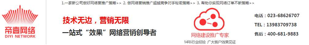 帝壹網(wǎng)絡(luò)10余年專業(yè)從事:網(wǎng)絡(luò)營銷、網(wǎng)絡(luò)推廣、視頻推廣、網(wǎng)站推廣的一家重慶網(wǎng)絡(luò)公司-16年專注:seo優(yōu)化排名技術(shù)、網(wǎng)站建設(shè)-公司品牌宣傳打造;生產(chǎn)型產(chǎn)品的推廣獲客實戰(zhàn)專家