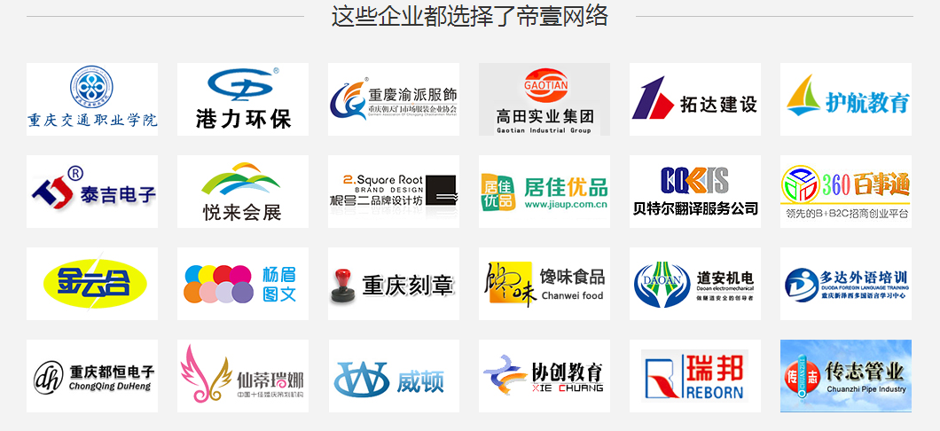 帝一網(wǎng)絡(luò)通過10年不懈努力和實干開拓;服務(wù)過的企業(yè)有上千家;網(wǎng)站產(chǎn)品服務(wù)主要應(yīng)用于政府單位:特警總隊、江北公安分局、渝北政協(xié)、渝北發(fā)改委,事業(yè)單位:重慶交通職業(yè)學(xué)院,中醫(yī)藥研究院等單位;推廣產(chǎn)品應(yīng)用于企業(yè)單位:港宏裝飾,三中英才,索通集團(tuán)等企業(yè);憑借快速的發(fā)展和實力的不斷壯大,帝壹網(wǎng)絡(luò)已經(jīng)成為北京新網(wǎng)白金分銷商、258集團(tuán)重慶銷售服務(wù)中心、騰訊EC代理商、北京息壤傳媒文化有限公司代理商。