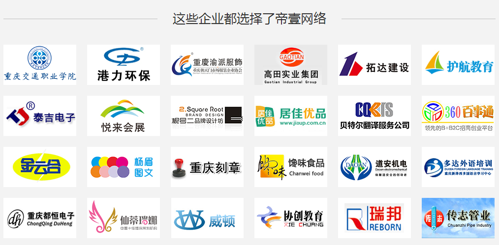 帝一網(wǎng)絡通過10年不懈努力和實干開拓;服務過的企業(yè)有上千家;網(wǎng)站產(chǎn)品服務主要應用于政府單位:特警總隊、江北公安分局、渝北政協(xié)、渝北發(fā)改委,事業(yè)單位:重慶交通職業(yè)學院,中醫(yī)藥研究院等單位;推廣產(chǎn)品應用于企業(yè)單位:港宏裝飾,三中英才,索通集團等企業(yè);憑借快速的發(fā)展和實力的不斷壯大,帝壹網(wǎng)絡已經(jīng)成為北京新網(wǎng)白金分銷商、258集團重慶銷售服務中心、騰訊EC代理商、北京息壤傳媒文化有限公司代理商。