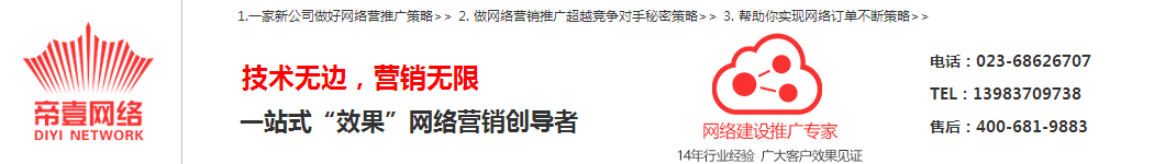 帝壹網(wǎng)絡(luò)10余年專業(yè)從事:網(wǎng)絡(luò)營銷、網(wǎng)絡(luò)推廣、視頻推廣、網(wǎng)站推廣的一家重慶網(wǎng)絡(luò)公司-16年專注:seo優(yōu)化排名技術(shù)、網(wǎng)站建設(shè)-公司品牌宣傳打造;生產(chǎn)型產(chǎn)品的推廣獲客實戰(zhàn)專家