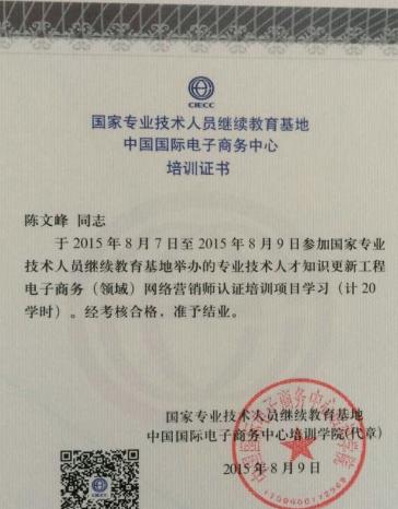 帝壹網(wǎng)絡(luò)創(chuàng)始人獲得:中國(guó)國(guó)際電商務(wù)中心-電子商務(wù)(領(lǐng)域)網(wǎng)絡(luò)營(yíng)銷師稱號(hào)